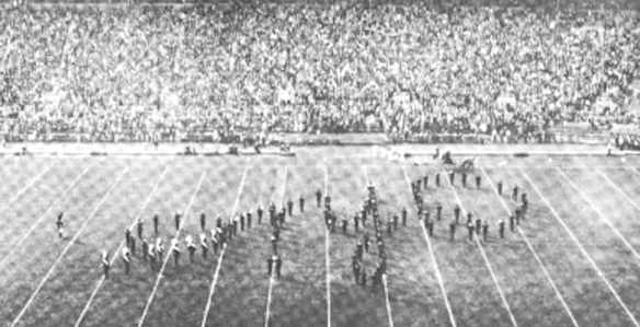 “There is a myth abroad in the land that George Hall ʼ35, of Flint, Michigan would like to straighten out. Ohio State people have long claimed that their band was the first to perform the word “Ohio” in script on the football field. ‘Taint so, says Hall, a former Michigan bandsman himself. Michigan was first. As proof he provides the accompanying photograph taken of the Michigan Band on October 15, 1932. It has just finished scripting ‘Ohio’ at halftime in the Ohio State Stadium. Ohio State publicity has long contended that the first script-writing by a band was performed by THERE band in 1936. Says Hall in a letter to the Michigan Alumnus: ‘I concede that Ohio State people can both write and spell and that their brass band is reasonably good, but they weren’t the first to do the script. We were!’